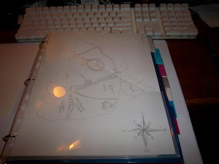 I am using a 1 inch 3-ring binder, with nice tabbed folder dividers for each section. I used a sheet of my daughters' colored construction paper for a cover to make it nice, since I haven't drawn anything worth using in years. Lots of construction paper. :) I have sections tabbed out, so I can start filling them. When I feel like it, I'll add to it, and start building on it. I even sketched out a rudimentary continental map that I've had floating in my head for a while. It's rough, and half of the countries aren't named yet, but it gives me some spacial references.
